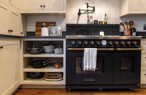- A chef’s kitchen fully stocked with cookware, dishes, and essentials like cooking oil, salt, and pepper