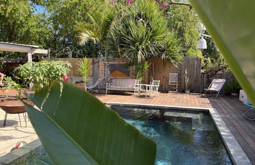 a tropical garden, a pool table, a veranda, kitchen overlooking the outside, an infinity pool of 4 meters by 6 meters.