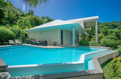 Upon your arrival, you will be enchanted by the tranquility of this place, nestled in the heart of a beautiful tropical garden where hibiscus, traveler's palm trees, palm trees, coconut trees, and lemon trees reign. The villa offers an intimate and exclusive setting, ideal for a relaxing getaway away from the hustle and bustle. It offers a panoramic view of the ocean and the Caravelle Peninsula. The subtly perforated walls allow for natural ventilation while enjoying the ocean panorama. There is a delightful sense of being outdoors while indoors.The confort of your sea view Vacation Home in Martinique