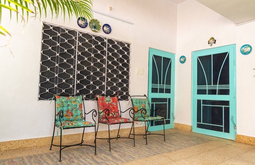 The Jaipur 1727 Homestay derives its name from the Pink City Jaipur and its founding year. Based on Jaipur theme and painted beautifully in turquoise and white combination. The house has a lush green garden, ample parking space, common sitting areas, a big lounge with books and a terrace.