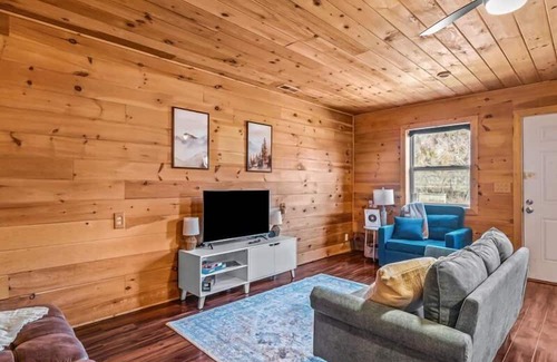 Step inside and unwind in the modern, yet rustic living space. Enjoy being indoors with beautiful all wood interiors, high speed internet, flat screen TVs with streaming access, full kitchen, modern futon, sleeper convertible twin sized chair, and a full bath you can soak in. The inviting bedroom boasts a plush queen bed, ensuring a restful night's sleep after a day of exploring.