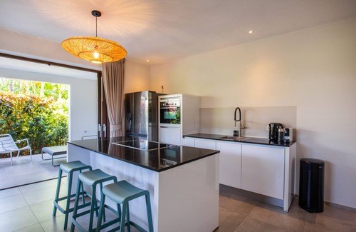 Your luxurious modern styled ground floor apartment can host up to 4 guests and measures 100 m2. It offers a spacious living room with an open kitchen which seamlessly blends the indoor and outdoor space. This apartment has two bedrooms with a/c and each a private bathroom. Your porch offers a comfortable seating and dining area where you can enjoy the cool breeze of the ever present Curacao trade winds and a relaxing view of the gardens.