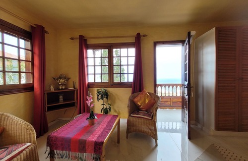 8,000 square meters of paradise! We are situated in a stunning, secluded location directly on the cliffs in the fertile north of Tenerife, amidst subtropical vegetation. Our vast grounds are an ideal place, especially during these challenging times, to keep your distance and feel at home. An oasis of peace and tranquility with stunning panoramic views of both the endless expanse of the Atlantic and the fascinating mountain world of Pico del Teide. A large seminar room is available for yoga, meditation, dance, music, and events.