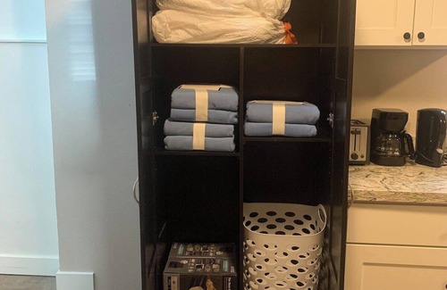 - In the Kitchen Pantry: Extra beds (air mattresses), extra blankets, pillows, and bed sheets, extra toilet paper, extra towels, extra batteries for electronics, laundry hamper, laundry bag, and first aid kit.