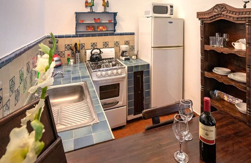 Decorated in colonial style, Casita Esquinera’s cozy bedroom has a queen bed and Cable TV. There is a workspace in the bedroom, and strong wifi can be found throughout the apartment. The kitchenette is fully equipped with appliances and a dining set, and meals can be enjoyed at the breakfast bar for two. The full bathroom has hot water and a stand-in shower.