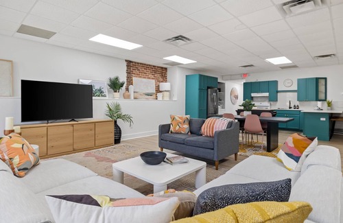 You and your guests will feel like you’re in an artist’s studio, as the entire loft has an artistic designer’s flair, from the colorfully painted walls and artwork to the hand-selected décor and accessories. The living room’s furnishings are stylish, yet built for comfort, and with a large flat-screen TV and an adjacent ping-pong table, entertainment and fun will rule supreme! When meals or snacks are on your mind, you’ll find all the essentials in the kitchen, including high-end appliances – a great dishwasher, too – and a mobile butcher-block center island and sweet stone countertop breakfast nook. The dining table is nearby, too, for sharing a meal with your peeps.