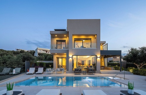 An autonomous, private, and luxurious villa is located on a hilltop in an amazing sea-view village in Kalyves. The beautiful three-storey villa offers a high quality of amenities and ensures that you will enjoy all the luxurious facilities. The neutral palette and minimalistic design will absolutely make the villa the perfect vacation spot for you and your loved ones.
