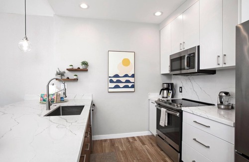 Sit back and relax in the living room complete with updated furniture and a brand-new flat screen TV to enjoy all your favorite shows. For added convenience, the sofa couch converts into a Queen-size bed, perfect for sleeping two additional travelers.