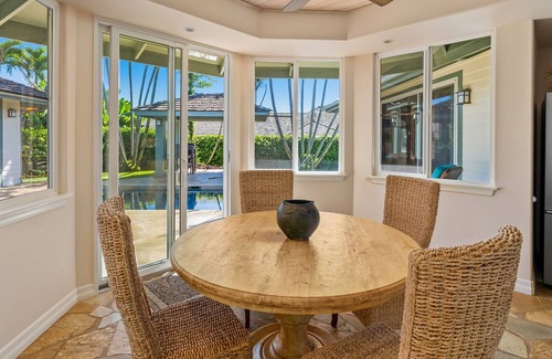 Kilohana at Poipu is a private tranquil vacation home nestled in the center of Kiahuna Golf Village and the Robert Trent Jones, Jr. golf course. This single-level home has a spacious indoor/outdoor living layout centered around a heated swimming pool and courtyard, perfect for entertaining. The main house offers one master suite along with a guest bedroom with air conditioning throughout. The attached ohana suite offers a second master bedroom also with Ac and direct access to the pool and courtyard.