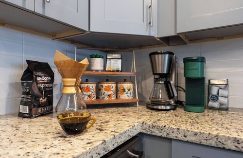 We love our caffeine fix and we know you do too. That’s why we have a full coffee/tea station including a keurig, automatic pourover coffee maker (recommended by the SCA Certified Home Brewers Program), grinder, Chemex, milk frother, a variety of teas, creamer, sugar, coffee beans, pods etc.