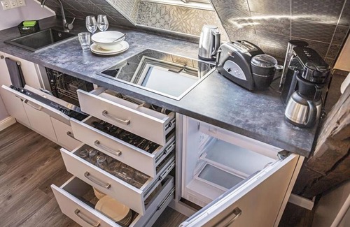 Our lovingly furnished apartments are a second home to feel good or perfect for a break from everyday life! Sleep like a king in the comfortable oversized boxspring beds (2.20 m) of the premium brand Royal Bedding®. The bed width is 2.00 m in the king-size apartments. All beds have a continuous extra high mattress for extra sleeping comfort. In the "Throne Room", the modern bathrooms, you will find a WC with integrated ventilation, a stylish sink and a floor-level shower with rain shower and hand shower. The kitchen is equipped with everything you need. Prepare for Take a delicious breakfast with Tefal Toast'n'Egg and brew your coffee with the Senseo Switch with either a filter or coffee pod. On the 4-plate ceramic hob can also prepare complete menus. A microwave grill provides food in minutes. And so that the washing up is not annoying, a compact dishwasher is ready. In the living area, you can relax after work, after a hard day or an exciting day. The comfortable sofa invites you to linger and with the large smart TV guaranteed no boredom! Even if the work is not quite done yet, a desk with comfortable seating is available in your apartment. A LAN connection and an additional light, where you can charge your mobile phone or tablet through the integrated USB port, ensure a good working atmosphere. You can safely lock your laptop or other valuables in the built-in laptop safe.