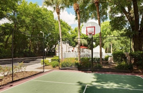 Property features an outdoor heated swimming pool, hot tub and a multipurpose sports court.
