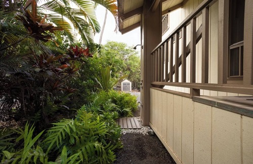 Welcome to the Queen Palm Suite, an inviting upstairs open-air studio with a charming side ocean view. Nestled in a prime area of Kona, this suite provides a blend of comfort and convenience for a great home base while exploring the Island.