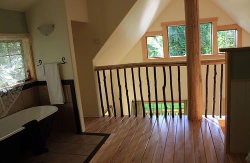 The spacious floor plan features a lofty cathedral ceiling accented with cedar-log timbers, and shining wood highlights throughout. The loft bedroom has a classic cast-iron tub beneath the window, where you can watch the sunlight dance through the cedar boughs above. The cabins' front deck offers idyllic views of the estate grounds below.