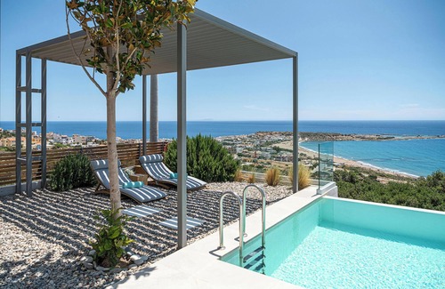 Nestled on the south coast of the island of Crete, Krystallon Villas, is a new and unique hospitality venue, consisted of 2 separate Villas, Krystallon East and Krystallon West, located on the hill of Panorama, the new settlement of Paleochora, a picturesque yet cosmopolitan village, at the south-western end of the prefecture of Chania, also known as the "Nymph" of the Libyan Sea. Krystallon Villas can be also rented together by large families or groups! Each villa offers amphitheatrical and unobstructed views of the Libyan Sea, Paleochora, and the mountains and they are just 1.2 km away from the lively centre of Paleochora, with its numerous tavernas, cafes and bars, which you can easily reach on foot or by bike. The nearest beach, that of Pachia Ammos, is 1.1 km away.