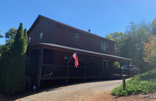 Large three-story cabin overlooking mountains, Brasstown Bald, Pastures and forest. The main deck features a wraparound deck on main floor with covered screened porch for bug free family dining, and entertaining space. Relax in the evening overlooking the stars while soaking in the spa located on the main exterior deck. Exterior decking & property has solar lights to lighten the way throughout the property. The interior main floor has a large open Kitchen and dining to Living area with large natural stone wood burning fireplace with ceiling that reach new heights. The main floor also features King Bedroom and Bathroom. Open stairway going up to the second floor leads you to the loft that overlooks the great room and large windows to view the mountains in the distance with additional sleeping or business area if needed in this area. Also, on this floor is the large Master Suite with cozy exterior private balcony. Basement features a Queen Bed, plus single bed, and Bath with doorway to the balcony. Our game room has something for everyone; ping pong, foosball, games, and dry bar with outdoor deck looking into backyard ready for entertaining. Other amenities are full stocked kitchen, Wifi, Direct TV, DVD player, outdoor stereo system, and flat parking area. We are located just minutes away from Blairsville, Hiawassee, Crane Creek Vineyard, Brasstown Valley Golf Resort and Spa, Young Harris College, Vogel State Park, Lake Chatuge, Helen, Murphy NC Casino, and Lake Nottely.