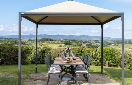 Thirty hectares of land delimit the immense spaces of this modern farm estate, with alternating olive trees, vineyard and woodland, fenced for about 12 hectares (by electro welded mesh height 1.80 m) leand for the most part passable on foot and suitable for playing games. A splendid, expertly-designed park of about 1500 sq m surrounds the house: between winding paths, bordered by wavy flowering bushes of herbs, which lead to the two ground floor entrances to the house, are large areas of manicured lawn, reinvigorated by young olive and cypress trees and, again, many bushes of lavender, rosemary, myrtle and sage adorning the walkways that lead to the set-up areas: the two gazebos (located on either side of the house in a panoramic position), a delightful seating area located at the entrance of the pool area, a children's play area and ping-pong table, a wood oven, barbecue area and the pool area provide guests with wonderful moments of relaxation and fun with the complicity of fascinating panoramic views from every part of the park. The property has an automatic access gate and a large parking area, located at the end of the short internal driveway, just a few steps from the entrances to the house.Please notice that photos are taken in spring, therefore flower blossoming, and the colours of the gardens' grass could be different at the moment of your arrival at the villa.