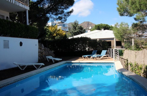 Apartment on the ground floor of a villa, located in a privileged place with nice views of the sea and Port de la Selva. It has a magnificent pool, garden and terrace overlooking the sea, and sun loungers for sunbathing and resting. It has two double bedrooms (one with a double bed and the other with single beds), a single bedroom and a games room that has a double bed and a single one. The kitchen equipped with oven and microwave and a large living room with views of the garden and television. Also two full bathrooms, one with a bath and the other with a shower. Air conditioning, heating and Wifi. The upper floor may be occupied by the owner when it comes, but the pool is for private use on the ground floor. The pool covers in all length, does not have an area for children. From inside the property, the accommodation has a private access. Very quiet residential area. The car park has to be done on the street, not inside the property, For 7-8 people. [hidden]