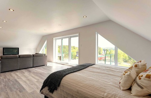 Le chalet peut accueillir jusqu'à huit adultes, avec une extension possible à douze personnes grâce au loft en saison froide. Pendant que les enfants s'amusent dans la salle de jeux bien équipée, les parents pourront se détendre dans le spa privé ou sur la grande terrasse avec vue sur le lac. Prendre note que la salle de jeux au sous-sol est accessible par l'extérieur seulement elle est situé dans le garage aménagé. Merci