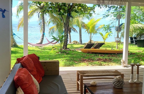 Hammocks, deckchairs await you for sunbathing in the garden facing the lagoon ideal for swimming.