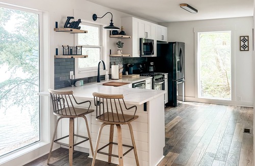The dining area seats 6 comfortably with 2 additional seats at the kitchen island. The kitchen is well equipped with all-new cookware, silverware, and plate setting for 8 guests. Appliances include a dishwasher, microwave, gas range, washer, and dryer. Screened outside patio with perfect seating for morning coffee or evening sunsets. Outdoor features include a gas grill and dining table with gorgeous lake views. WiFi and access to streaming services are provided. Boat dock access is steps from the back deck and year-round water access. Small beach area with steps, depending on lake water levels.