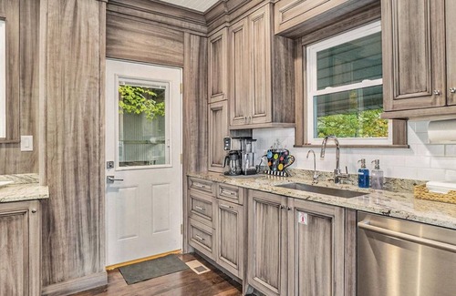 The fully stocked kitchen includes every appliance you could imagine including a Ninja coffee maker with grinder and an espresso shot option. A Nutribullet full size blender is ready for whipping up some frozen cocktails. There’s even a waffle maker for the kids! Right off the kitchen, find a full size front loader washer and dryer hidden in a convenient closet space. A fully updated bathroom with a walk-in shower is also located on the main floor.