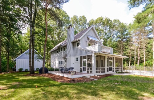 Lake Trail Treehouse has it all! Plenty of room in this 4 bedroom 4 bath cottage minutes from Saugatuck. Relax in the heated swimming pool during the day and the hot tub at night. This cottage has a large screened in porch area for those long evening conversations with family and friends. Make smores by the fire pit or enjoy the warmth of the indoor fireplace for those cool nights or off season stays. Head down the path to Silver Lake of Saugatuck and enjoy the natural beauty of the Kalamazoo river and the preserve. This cottage truly has it all. The Master bedroom has a king bed, sofa, rocking chair, balcony overlooking the pool, and an attached master bath with a double head shower, and two sinks. Bedroom 2, "The Bunkhouse", has two queen beds with 2 twin beds on top and an attached bathroom with a shower and two pedestal sinks. These bedrooms are on the second floor. The third bedroom, "The Beehive", located on the main floor has a queen bed with a chair, TV, and an attached bathroom with combination tub/shower. The fourth bedroom "AJ's Garden" in the lower level has two queen beds, a walk in closet and a tv. The lower level bathroom has a tub/shower combination and double faucet farmhouse style sink. If you wish to stay in you can have a cookout poolside or cook dinner inside in the gourmet kitchen. Sit in the custom dining area that seats 13 or have dinner on the screened in porch. Enjoy the large screen tv over the fireplace in the living room or the lower level lounge area with custom book nook, large tv, two couches & pop-a-shot basketball game. Create lifelong memories at Lake Trail Treehouse. Pool and hot tub is open from Memorial day through September.