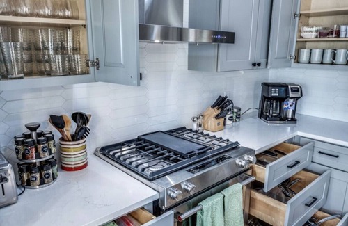 The home features two fully equipped kitchens, ideal for preparing meals. Whether you’re cooking for a family reunion or hosting a group event, you’ll have plenty of space and high-end appliances to create memorable meals. Gather at the dining room table, seating 10, or at the kitchen island with seating for 7.