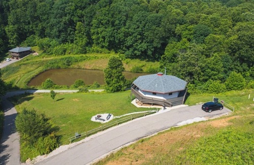 Lake View - Hocking Hills is perfect fit for two-four couples! It sits on a hill overlooking the Chalet’s private stocked fishing pond. The deck wraps around the entire top floor of its octogon footprint. Enter the open living area from the lake side – to find wood-burning fireplace, satellite tv, kitchen with full-sized appliances - including dishwasher and dining for eight. Two bedrooms and a spacious bath with walk-in-shower and double vanities. A whimsical spiral staircase, connects to the downstairs, where there is a second gathering area with satellite tv and dvd, and an old school arcade game. Two bedrooms and another spacious bathroom. A door opens to the covered outdoor porch and hot tub with a view. Both charcoal and gas grills. Fire pit. Please note that our cabins that sleep 8 or more people have a minimum age requirement of 25. No pets allowed. SIMILAR If you like Lake View, you will also like Tree Top (same layout) and may like Overlook (sleeps 6) and Lily Pad (sleeps 4), all of which are on the same campus and were built the same time.