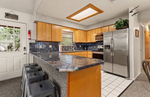 Grill out on the charcoal grill while watching the sun dip below the hills, or enjoy the peaceful Hill Country setting with a drink in hand. Inside, you'll find all the comforts of home, including central AC and heat, digital cable TV, and free high-speed WiFi. Pets are welcome too, so feel free to bring your four-legged family members!