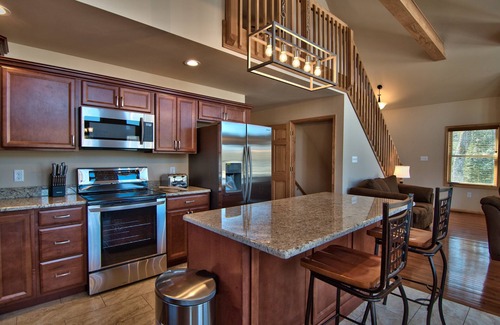 As you enter, the main floor has 4 bedrooms and 2 full baths. An open living room, dining room, and kitchen make for great gatherings and conversation! Just beyond the kitchen, you can make your way out to the 400-square-foot deck which has full unobstructed views of the lake. There you can sit out on a lounge chair and take in the fresh air or relax by reading a book! One flight up there are an additional two master bedrooms with private baths and a loft area for kids which has sleeping for up to 6!