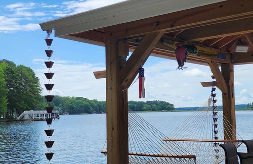 Our updated waterfront single-story cottage overlooks a beautiful flat lawn with expansive views of Lake Gaston from the dock. The water is 7 feet deep off the new Trex dock for excellent swimming and for tie-up of your boat! The yard is whimsically decorated with fun decor and has multiple sitting areas and chair swings to enjoy the lake views. A wraparound deck, both a propane grill and a Blackstone and various seating areas allow for peaceful meals. The secluded wood-burning fire pit area has 6 Adirondack chairs (and 4 more on the dock). The property is very private; the neighboring homes are set further back on either side and there are many trees edging both sides of the property.