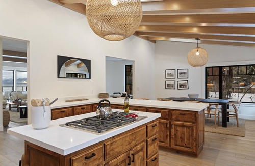Expansive views of the exceptionally beautiful Lake Tahoe!! Positioned directly on the lake with a private dock + buoy for summer boating. Newly renovated luxury 4 bedroom home with enormous shared spaces. Huge kitchen and dining area opens to huge living room. Modern, tasteful decor, with all new luxury furnishings to make you feel at home and inspired! You'll love our 38 x 19 ft Great Room with breathtaking wall to wall views of the lake. Wake and fall asleep looking at water! This huge common space boasts a wet bar, gas fireplace, game table, a 65" TV and comfy, cozy seating areas. The kitchen has ample counter tops and cabinets, a long peninsula bar with stools for four. A 3 x 8 foot table seats 8 or more! You'll appreciate the exceptional natural light throughout the house and enjoy walking barefoot on our beautiful hardwood floors, thanks to radiant floor heating!
