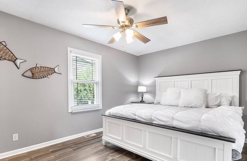 Enjoy unique small town charm with amenities such as lake side access, private assigned dock, large back patio with led patio lights, Hot Tub, and grill. After a fun day on the water or just exploring the many unique places around Cicero and surrounding areas come home at night and warm up to a nice wood fire in the large brick fireplace in front of your 65 inch smart TV. 65 inch TV also provided in the Owners suite with king bed. Other two bedrooms have queen beds. Free WiFI Enjoy!!!