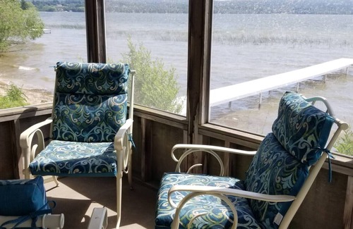 Right on the water, very quiet. Comes with 4 shared tandem kayaks, 4 kiddo kayaks, 4 paddleboards, propane grill, dock, picnic tables, swim raft and lily pad. 7 miles to Frankfort and 8 to Beulah. All linens provided except beach towels; beds made.