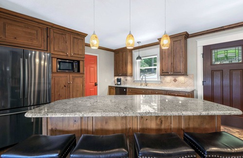 Between two distinct living spaces, the main home and a guest home, everyone will have the opportunity to spread out and find their own private corner while communal spaces bring you back together to celebrate and create memorable moments. In the main home, both upstairs and downstairs living areas include plush sofa seating along with smart TVs for streaming all your favorite entertainment. The stylish kitchen is a chef’s delight, showcasing full-sized appliances, granite countertops, and rich wood cabinetry stocked with cookware and dining ware. Need additional storage and preparation options? The guest house has you covered, the kitchenette adding reinforcements of ample cabinetry, a mini refrigerator, coffee maker, and microwave. You’ll have your choice of options for where to enjoy your meals between the main home with island and table seating for a combined 8 diners as well as a table for 4 on the lower level, as well as a dining table for 6 in the guest house.