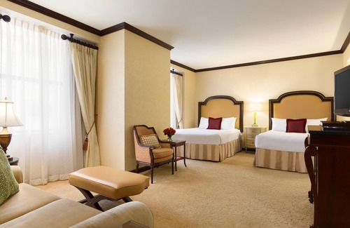 Designed for families and travelers who need space, these beautifully decorated hotel rooms are classically elegant with modern luxuries. The Double Queen Room features two queen beds, sitting areas, breathtaking mahogany pillars, and beautifully appointed four-fixture bath with deep-soaking tub.