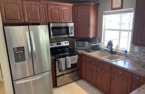 The fully fenced backyard provides a great space for your dog to run around freely. Inside, the kitchen is fully equipped with a spacious countertop for meal prep, complemented by a higher counter with bar stools – perfect for drinks, snacks, or casual conversation with friends and family. A grill is available to use, located in the lanai, perfect for outdoor cooking and enjoying meals in the fresh air. Two dining options are available: a dining room table for a relaxed meal, or a patio table in the lanai for dining al fresco.