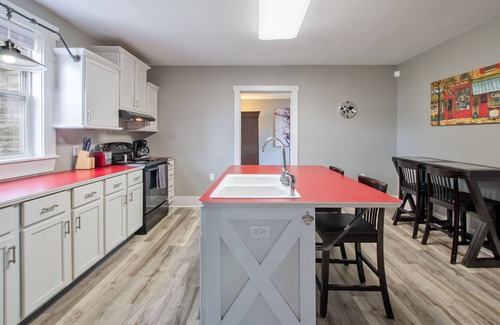 Just off the living area is a clean and friendly kitchen. The cheerful red from the living room continues here, with eye-catching red countertops. White cabinets, a stainless steel refrigerator, and a large island with a sink create an efficient spot to brew the morning coffee and bake some warm muffins in the mornings. Unmistakable farmhouse charm can be seen in the island trim and doors.
