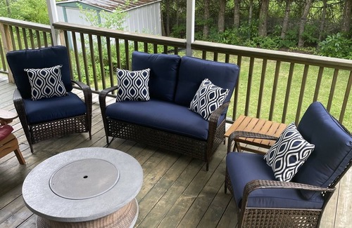 • 3 firepits: 2 wood-burning ones next to the lake & a gas fire table on the deck