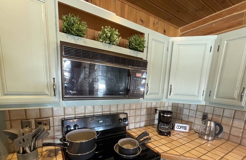 The cabin sits in a large grass field making it ideal for summer events, such as family reunions, weddings, or business retreats. There is a picnic area with two tables and a fire pit for afternoon lunches or evening barbecues. Inside there are large, open entertainment spaces which allow for groups to spend time with one another. The kitchen has everything you need to create and enjoy family meals.