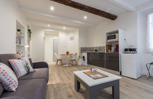 A pretty 30 m2 studio with AC located behind the Saint-François Square. All amenities around and close to the tram stop that connects the airport. SpaceIMPORTANT : Following several comments on the bedding confort, the sofa-bed mattress was changed in April 2025.Welcome to our Apartment in the city center,Located on the first floor without elevator, you will find all the comforts: proximity to touristic places, space, A/C, equipped kitchen, washing machine, Wi-Fi... This apartment consists in a living room with a comfortable sofa bed and TV, kitchen and diner table and a bathroom with shower and WC. Kitchen is fully equipped: fridge, hotplates, microwave, coffee machine, kettle and washing machine. Access Apartment is ideally located next to Saint-François Square, less than 5 minutes away from Garibaldi Square’s tram. The apartment is fully equipped. Bed linens and bathroom towels are provided, and you will have access to the complete accommodation. Interaction Bnb Groom Services’ team is glad to greet you in Nice.Keys will be given to you in our office, Bnb Groom Services. We can also organize a check in on site depending on your arrival time and our availability. Don't hesitate to share you arrival information as soon as you have it.We will be there to advise you before and during your stay, available by phone or by email to answer any questions and make sure you spend a great stay at your home away from home. Neighborhood Old Town is the historic district of the city with its narrow streets and colorful buildings. This is also a popular and lively area of Nice. This situation offers you the opportunity to do all your food shopping by walking, as well as a multitude of restaurants and many shops… and of course beaches and the Promenade des Anglais at 5 minutes on foot. Saint-François Square hosts the famous fish market every morning. There is also one of the city's best-known butchers and a supermarket, making it easy for you to stock up on supplies during your stay. Walk along the streets of the Old Town and you will find Rosseti Square with its famous ice cream and the “Cours Saleya” and its famous flower market. Transit Access to accommodation from the airport is possible by tram: take the line n°2 in direction of Port Lympia and stop at Garibaldi Le Château. Journey takes only 30 minutes and this stop is 250m away from the apartment. You can also ask us to arrange a private car transfer from the airport to the apartment. Train station « Nice Riquier » is 20 minutes away on foot, allowing you to discover Antibes, Cannes, Grasse, Monaco, Menton or even to go in Italy easily. You can come in Nice by car and park in the streets around the Harbor area or in a public parking. Closest one is Parking Promenade des Arts. Access to the building isn’t possible by car as the Old Town is a pedestrian zone. IMPORTANT - RULES OF PROCEDURE :For security reasons, before arrival an online check-in should be completed via our Yaago application in which the person in charge of the booking should provide identity document.The accommodation should be returned in a suitable state of use, respecting the premises, the neighborhood, as well as basic rules of cleanliness and hygiene.Parties and noisy evening gatherings are not allowed.Smoking isn’t allowed inside.Non-compliance with these instructions may result in a deduction from the deposit or cancellation of the stay.Thanking you in advance for your kind collaboration.