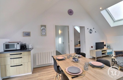 Located at the back of the owners' house and adjoining another gîte, this accommodation on the 1st floor is accessible by an external staircase. On the same level, it is organized as follows: - a living room with fitted kitchen, dining table, office area and lounge - 2 bedrooms each with 2 beds of 90 x 200 cm, modular into a bed of 180 x 200 cm - a bathroom with shower and washing machine - a separate toilet For your comfort, towels and sheets are provided and the beds made on your arrival. Outside: - a private terrace with garden furniture, parasol and barbecue - shared with the other gîte: a pétanque court and a hammock Parking dedicated to the gîte on the property Enjoy the tranquility of your holidays in the heart of this green and wooded environment. Disconnect: here, the Wi-Fi takes its time, just like life in the countryside. Enjoy the bright living room and when the weather is nice, settle down on the private terrace overlooking the communal grounds with a pétanque court, a hammock and sun loungers. Less than a kilometer away, easily reach the A84 motorway, linking Rennes to Caen and find essential shops 4.2 km away. In terms of heritage, there is plenty to do: 5 km away, let yourself be enchanted by the Rocher Portail castle and become a sorcerer's apprentice for a day. Stroll through the Haute-Bretagne botanical park 10 km away or discover the City of Art and History of Fougères and its medieval castle 19 km away. Don't miss a visit to the "Merveille": the Mont Saint-Michel abbey 25.4 km away.