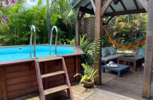 Its outdoor lounge is surmounted by a very pretty carbet near the swimming pool, in the middle of a fully enclosed garden.