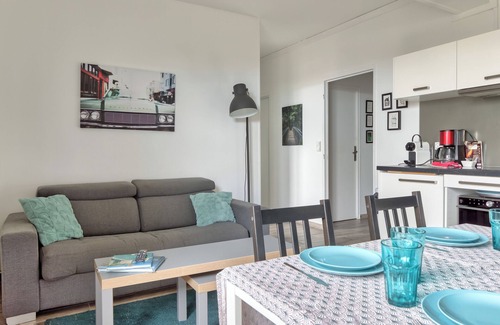 Located on the 1st floor of a quiet residence, this beautiful 50 m² 4-star flat is ideal for a comfortable stay by the sea. It comprises two bedrooms, decorated in blue and green tones, one with a 140 cm double bed and the other with a 160 cm bed, a study area and an armchair.