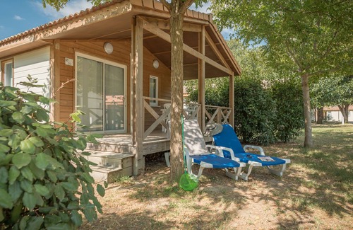 "Le Mediterranée", 3-room bungalow 35 m2. Modern furnishings: living/dining room with dining table, satellite TV, international TV channels and air conditioning. 1 room with 1 french bed (160 cm). 1 room with 2 beds (80 cm). Kitchenette (4 hot plates, toaster, kettle, microwave, freezer, electric coffee machine). Shower, sep. WC. Electric heating. Terrace roofed. Terrace furniture, deck chairs. Facilities: children's high chair, baby cot for up to 2 year olds (extra). Internet (WiFi, extra). Maximum 1 pet/ dog allowed.