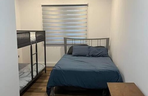 It offers an ideal bedroom configuration, with 3 bedrooms in the basement (two bedrooms with queen-size beds and one bedroom with a double bed and a bunk bed on 2 levels, each with a single bed). There's a full bathroom on this level, as well as laundry facilities (washer/dryer) and a large family room with a queen-size sofa bed.