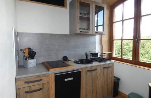 Former coach relay of the 16th century, this gîte has been completely renovated in eco-construction and rehabilitated with sustainable materials. Easily accessed, near the cities of Tarare & L'Arbresle (10 km away), 2 km from the A89 motorway exit (Pontcharra-sur-Turdine), perfect for a stopover or longer stay in the South Beaujolais. On a farm, large stone-built house also including owners' home and farm buildings. Gîte is on 1st floor (accessed via outside and inside stairs) and has separate entrance. Living room with kitchen area. Wc. Lounge (sofa bed providing sleeping arrangement for 2 people). Shower room. 2 small sleeping areas for 2 closed by sliding doors (1 with bunk beds, 1 with 2 single beds). Travel cot on request. Bed linen supplied free. Beds made up on arrival. For longer stays, a compulsory intermediate cleaning will be carried out every 2 weeks by the owners, and charged 30 euros (price per cleaning service). Outdoors : small private gravelled ground (in progress, unclosed), charcoal barbecue, room including shared washing-machine, parking to front. On site : pigs, hens, cows, possibility to visit the farm and buy some farm produce. Railway station of St-Romain-de-Popey 2,2 km away.