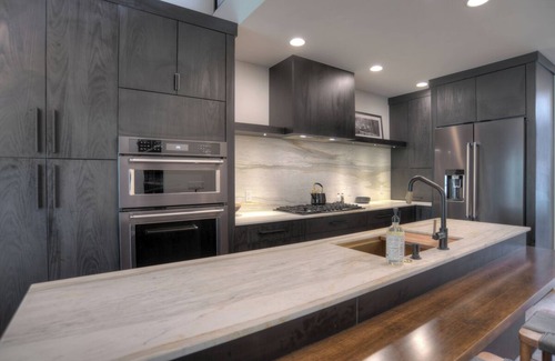 The living space has new, elegant wood flooring and tongue-and-groove vaulted ceilings, Lyric Fireplace with custom iron surround for a cozy yet sophisticated ambiance, and a smart TV with cable. It is furnished with CB2 Lenny Kravits Collection and Arahus furnishings, rugs and lighting. The full kitchen features KitchenAid Platinum Appliances, Bosch Gas Cooktop, and a Zephyr Dual Zone Wine Fridge. The designer bathrooms have top-of-the-line fixtures, floor to ceiling tiles and radiant in floor heating. The huge deck offers expansive views over the golf course and granite cliffs, ideal for relaxing or entertaining. Other custom features are solid wood barn doors, desk/chair in the loft, electric blinds, washer/dryer. There is even a floor-to-Ceiling Wine Rack built for the wine connoisseur and a mirrored glass bar area, adding a touch of elegance to your entertaining space. Great WIFI speeds of 100+ mbps.