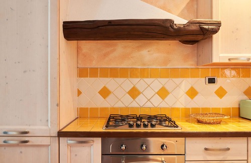 "Leonardo", 3-room house 80 m2 on 3 levels. Object suitable for 4 adults + 1 child. Comfortable furnishings: living/dining room with dining table and satellite TV. Exit to the terrace. Open kitchen (oven, dishwasher, 4 gas rings, freezer, electric coffee machine). Upper floor: 1 room with Dressing room with 1 double bed. Exit to the balcony. Shower/WC. Gas heating. 2nd upper floor: 1 open room with sloping ceilings with 1 bed and 1 double bed. Parquet floors. 2 balconies, large terrace 25 m2, small terrace. Terrace furniture, barbecue (portable), deck chairs (2). Facilities: washing machine, children's high chair, baby cot. Internet (WiFi, free). IT013216C2M9TI4TFA